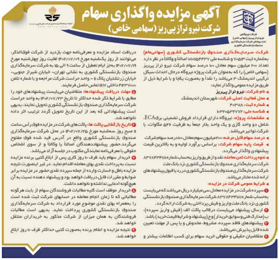 به گزارش روابط عمومی هلدینگ صباانرژی، متن کامل آگهی واگذاری شرکت نیرو تراز پیریز به شرح ذیل است:
