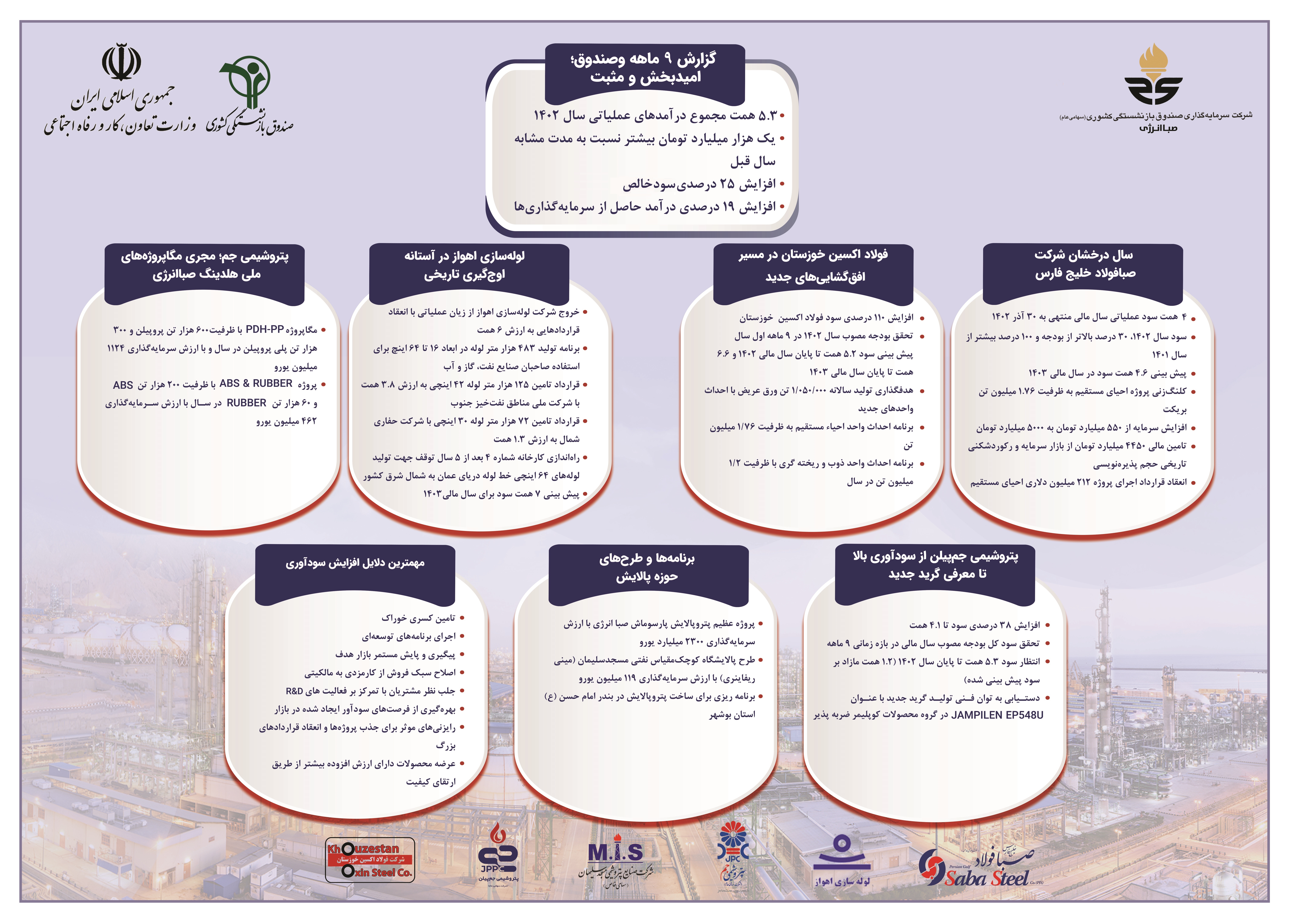 همچنین گزارشی از برنامه ها و دستاوردهای شرکت صبافولاد خلیج فارس توسط مدیران فنی حاضر در خط تولید صبافولاد خلیجفارس به صورت برخط ارائه شد که تحقق بزرگترین تامین مالی تاریخ بورس با پذیرهنویسی 4.5 هزار میلیارد تومان و راهاندازی پروژه احیای مستقیم شرکت صبافولاد خلیج فارس به ظرفیت 1.76 میلیون تن بریکت گرم از مهمترین عناوین این گزارش است.